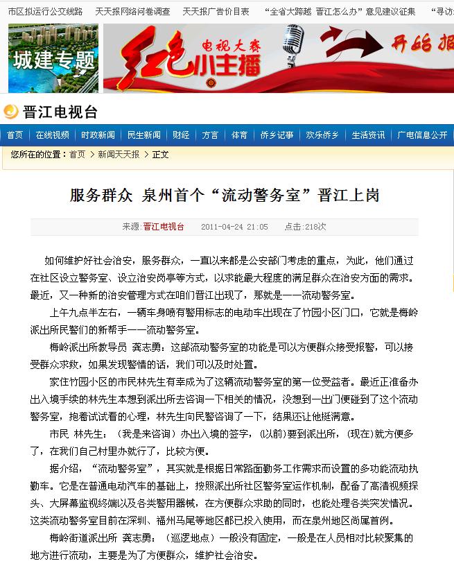 晉江電視臺(tái)報(bào)道:服務(wù)群眾 泉州首個(gè)流動(dòng)警務(wù)室 晉江上崗