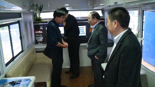 江西省公安廳紀(jì)委書記李煌(左一)參觀鴻馬流動(dòng)警務(wù)室給予好評