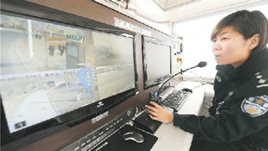 工作人員在流動警務(wù)室上觀看監(jiān)控