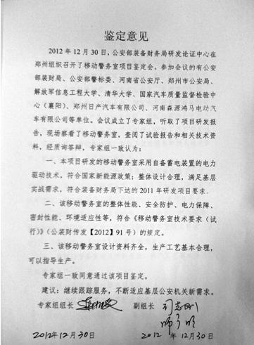 12月30日上午,公安部裝財(cái)局巡視員費(fèi)曉燕率技術(shù)鑒定評(píng)審小組成員蒞臨河南森源鴻馬電動(dòng)汽車有限公司,針對(duì)鴻馬公司和公安部聯(lián)合研發(fā)生產(chǎn)的移動(dòng)警務(wù)室進(jìn)行技術(shù)鑒定評(píng)審。省公安廳裝備財(cái)務(wù)處樊恒、李森林、師廣明、趙俊杰等幾位領(lǐng)導(dǎo)陪同評(píng)審。
