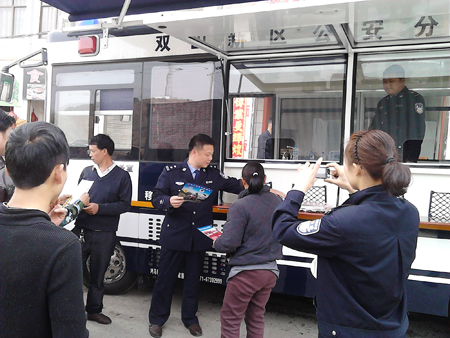 雙山新區(qū)公安分局黃局長在鴻馬流動(dòng)警務(wù)室前給群眾發(fā)宣傳資料