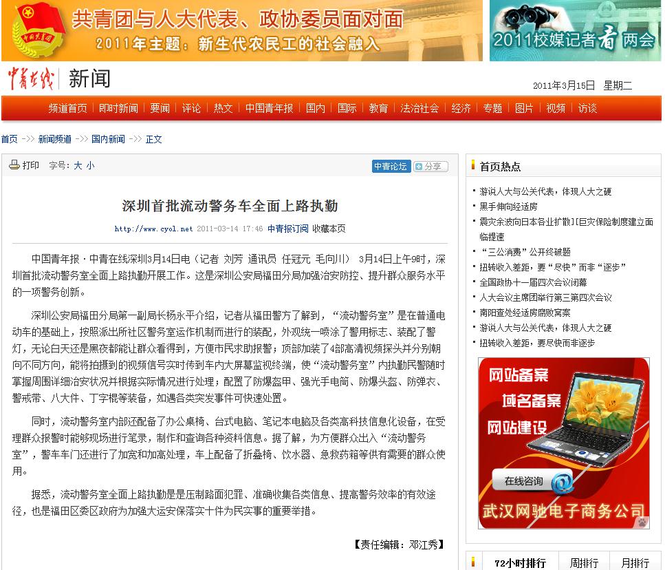 我公司森源鴻電動汽車流動警務(wù)室收車儀式被各大新聞媒體報道下面是中青網(wǎng)報道: