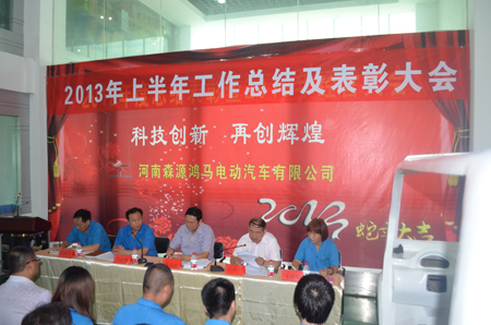 7月2日下午,在河南森源鴻馬電動(dòng)汽車(chē)有限公司展廳隆重召開(kāi)2013年上半年度工作總結(jié)及表彰大會(huì),公司董事長(zhǎng)孔慶珍、總經(jīng)理馬鴻軍、副總經(jīng)理邢會(huì)敏、王秋榮出席本次會(huì)議,會(huì)議由公司副總邢會(huì)敏主持。