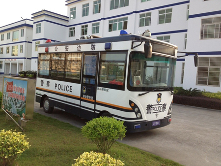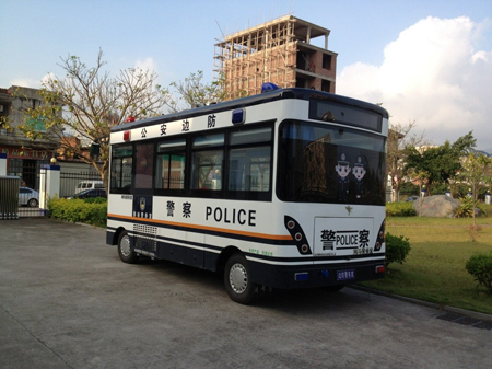 據(jù)漳港邊防派出所民警陳斌介紹,該移動警務(wù)室以電動警務(wù)車為載體,可容納3-4名民警同時辦公,一次充電可行駛30余公里,堪稱一個流動的“派出所”。車前、尾部安裝有LED電子屏,車頂不同角度還安裝了4個監(jiān)控探頭,通過車載3G無線網(wǎng)絡(luò)將現(xiàn)場監(jiān)控畫面實時傳輸至指揮中心。移動警務(wù)辦公室控制臺是整個流動警務(wù)室的“大腦中樞”,車載報警調(diào)度指揮系統(tǒng),支持圖像無線傳輸系統(tǒng),并能通過車載3G無線網(wǎng)絡(luò)和指揮中心“互聯(lián)互通”,實時調(diào)取路面監(jiān)控畫面,實現(xiàn)“移動作戰(zhàn)”。