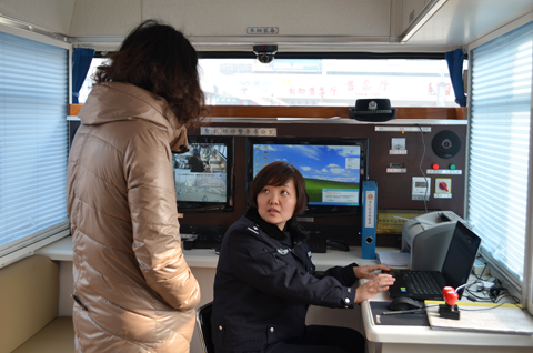 據(jù)值班民警介紹,這2臺移動警務(wù)室車內(nèi)功能齊全,設(shè)備先進,裝備了公安內(nèi)網(wǎng)電腦、3G視頻傳輸設(shè)備、打印機、掃描儀等便民服務(wù)設(shè)施?梢栽谲噧(nèi)進行現(xiàn)場指揮調(diào)度、接處警登記反饋、信息查詢、案件處理、糾紛調(diào)解、便民服務(wù)等一系列公安基礎(chǔ)業(yè)務(wù)。每輛警務(wù)車配備3至4名值班民警,在做好日常巡邏工作,為人民群眾提供方便的同時,對震懾違法犯罪分子和化解矛盾糾紛起著積極作用。