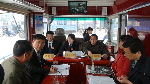工作人員在移動(dòng)法庭內(nèi)審理案件