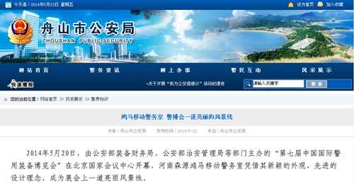 2014年5月20日,由公安部裝備財(cái)務(wù)局、公安部治安管理局等部門主辦的“第七屆中國國際警用裝備博覽會”在北京國家會議中心開幕,河南森源鴻馬流動警務(wù)室憑借其新穎的外觀、先進(jìn)的設(shè)計(jì)理念,成為展會上一道亮麗風(fēng)景線。