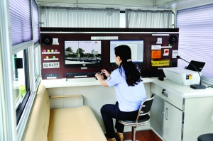 昨日,記者在萬(wàn)達(dá)廣場(chǎng)見(jiàn)到了這樣停放在路邊的“流動(dòng)警務(wù)室”。據(jù)清河區(qū)治安大隊(duì)大隊(duì)長(zhǎng)鄭瑩芳介紹,這輛“移動(dòng)警務(wù)室”是清河公安分局上月購(gòu)買(mǎi)的新式警用裝備,也是淮安警方第一輛“移動(dòng)警務(wù)室”。