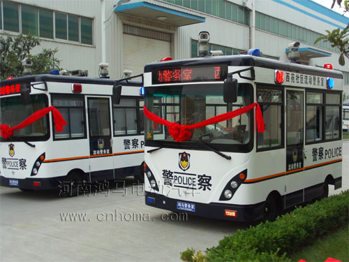 5月27日下午五時許,發(fā)往廣東中山市西苑社區(qū)派出所的兩輛4.2米長的流動警務室停在森源鴻馬電動汽車研發(fā)中心的廣場上,這輛移動的警務室將發(fā)往中山市西苑社區(qū)執(zhí)行巡邏任務。
