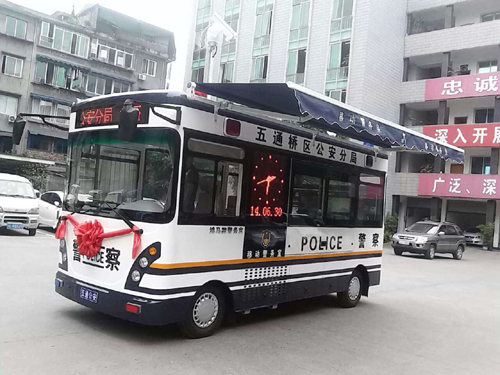 這是一款集移動巡邏、處置警情、移動監(jiān)控、宣傳咨詢及服務群眾等多功能為一體的警務用車,車頂前面及側面各安裝一塊顯示屏,可以不斷滾動播放宣傳字幕及視頻,還有多個不停閃爍的警示燈,對違法犯罪份子可以起到震懾警示作用。車頂配有一枚360度探頭和三枚定向探頭,可以實現(xiàn)對周邊區(qū)域的全方位掃描,車內民警可以將該車周邊的情況看得一清二楚,及時洞悉警情,如果發(fā)現(xiàn)險情,民警立刻能通過聲音輸出系統(tǒng),向外界發(fā)出警報。車身左側設置一個接待窗口,可以現(xiàn)場辦公,隨時接處警,對震懾犯罪起到積極作用。
