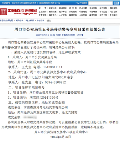 鴻馬流動(dòng)警務(wù)室河南周口第五分局中標(biāo)公告