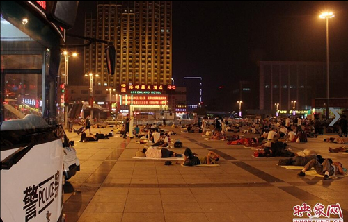 連日來,鄭州市持續(xù)高溫天氣。在鄭州火車站東廣場,每天晚上來此露宿納涼者上百人,一部分是準(zhǔn)備乘坐第二天早上火車的旅客,為了節(jié)省路費(fèi)沒有住在旅館,而在廣場上鋪上報(bào)紙坐下休息。還有一些住所條件簡陋的來鄭務(wù)工者,直接找個(gè)角落躺在地上睡覺。
