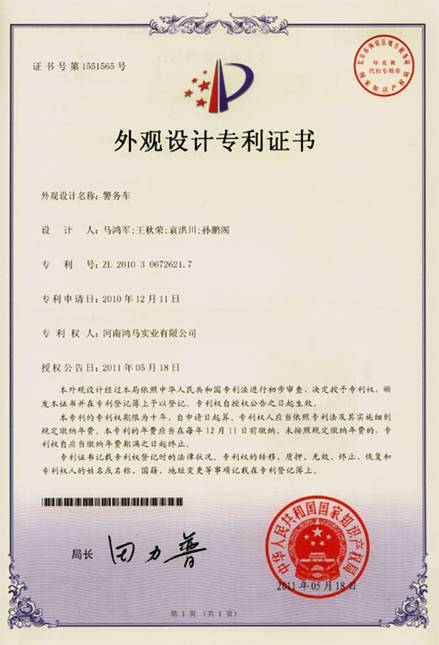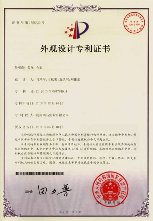 鴻馬電動(dòng)車臺(tái)面外觀設(shè)計(jì)專利證書(shū)