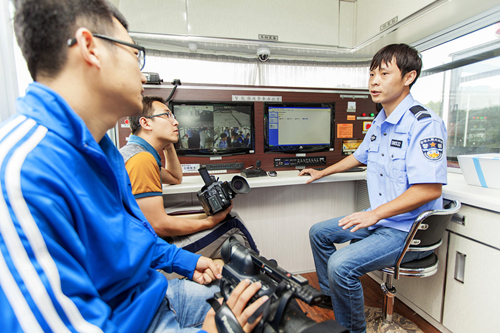 工作人員向記者介紹移動(dòng)警務(wù)室功能