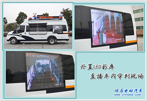 該車集訴訟服務(wù)、巡回審判、法制宣傳、執(zhí)行指揮四大功能于一體,車內(nèi)設(shè)置有審判桌椅、電子公告牌、室外LED屏、審判法庭信息化系統(tǒng)等一系列設(shè)備。為保障全天候運(yùn)行、特殊情況下執(zhí)法,還專門裝配了高功率照明攝像頭系統(tǒng)、擴(kuò)音設(shè)備等器材,是一個(gè)智能化、小型化、移動(dòng)式的“科技法庭”。