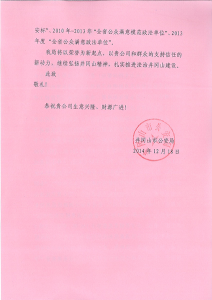 首先,代表井岡山市公安局全體民警衷心感謝貴公司長(zhǎng)期以來對(duì)我局的大力支持和幫助!