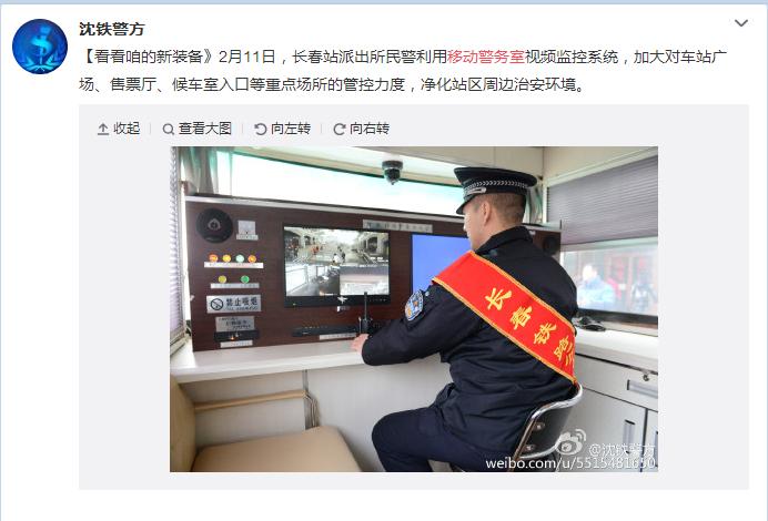 【看看咱的新裝備》2月11日,長(zhǎng)春站派出所民警利用移動(dòng)警務(wù)室視頻監(jiān)控系統(tǒng),加大對(duì)車站廣場(chǎng)、售票廳、候車室入口等重點(diǎn)場(chǎng)所的管控力度,凈化站區(qū)周邊治安環(huán)境。