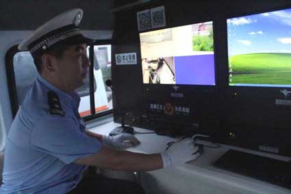 記者從警車交付現(xiàn)場了解到,這種外形像“微客”,空間擺設(shè)像一間小型辦公室的警車,配有兩臺可360度全方位監(jiān)控高清攝像頭及相應(yīng)的電腦,能夠錄制路面動態(tài)視頻。外掛車載LED顯示屏可及時發(fā)布雨雪冰凍等提示信息。執(zhí)法過程中,民警運(yùn)用車內(nèi)電腦與公安網(wǎng)絡(luò)鏈接,可以對涉牌涉證、走私、盜搶、拼裝機(jī)動車、駕駛?cè)丝鄯值惹闆r進(jìn)行查詢、上傳及處罰。