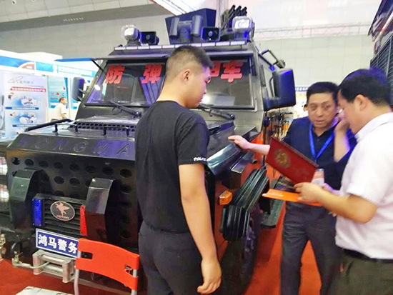 森源鴻馬業(yè)務(wù)人員向領(lǐng)導(dǎo)介紹鴻馬裝甲防暴車